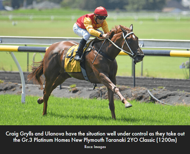 Speedy filly Ulanova (Santos x The Fairy's Kiss) gave her rivals a good old-fashioned beating as she led all the way to take out the Gr.3 Platinum Homes New Plymouth Taranaki 2YO Classic (1200m) in effortless fashion.