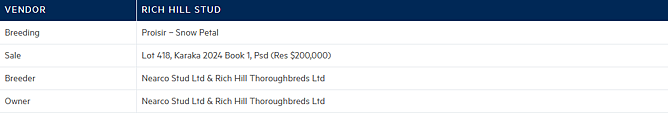 The $18,500 McFarlane Mile (NZB Mega Maiden Series) (1600m) was won by Frozen Fortune (NZ) (Proisir) for owner-breeders Nearco Stud Ltd and Rich Hill Thoroughbreds Ltd. That same partnership bred the dual Group One winner and A$3.5m earner Aeliana, who was a $180,000 purchase from Rich Hill’s Book 1 draft at Karaka 2023.