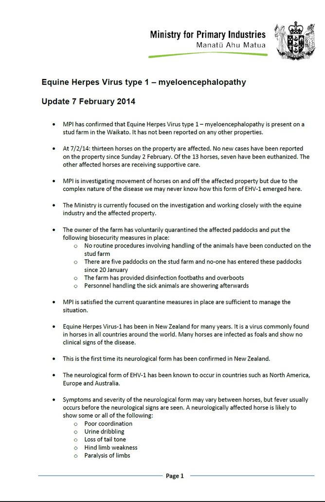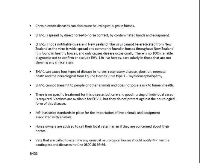 Update from Ministry of Primary Industries on Equine Herpes Virus type 1 - myeloencephalopathy