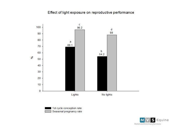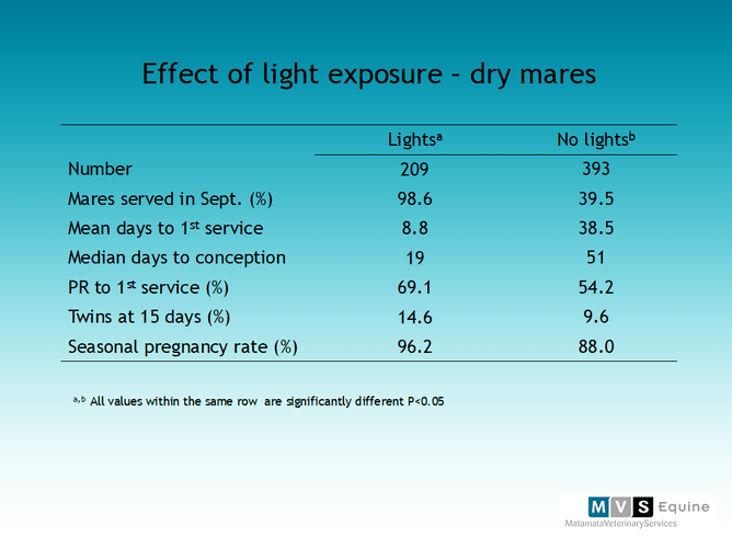 A New Zealand study looking at reproductive performance of Thoroughbred mares in the Waikato region, showed light exposure significantly increased the odds of dry mares conceiving by the end of the season. This occurred due to a combination of an increased first cycle pregnancy rate and increased number of service opportunities in a season. The start of mating to conception interval was also shorter in dry mares under lights.