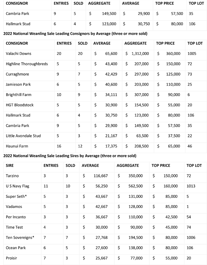 105 quality weanlings sold for an aggregate of $3,486,000. The average climbed to $33,200, while the median settled at $16,000 and the clearance rate closed at 88%.